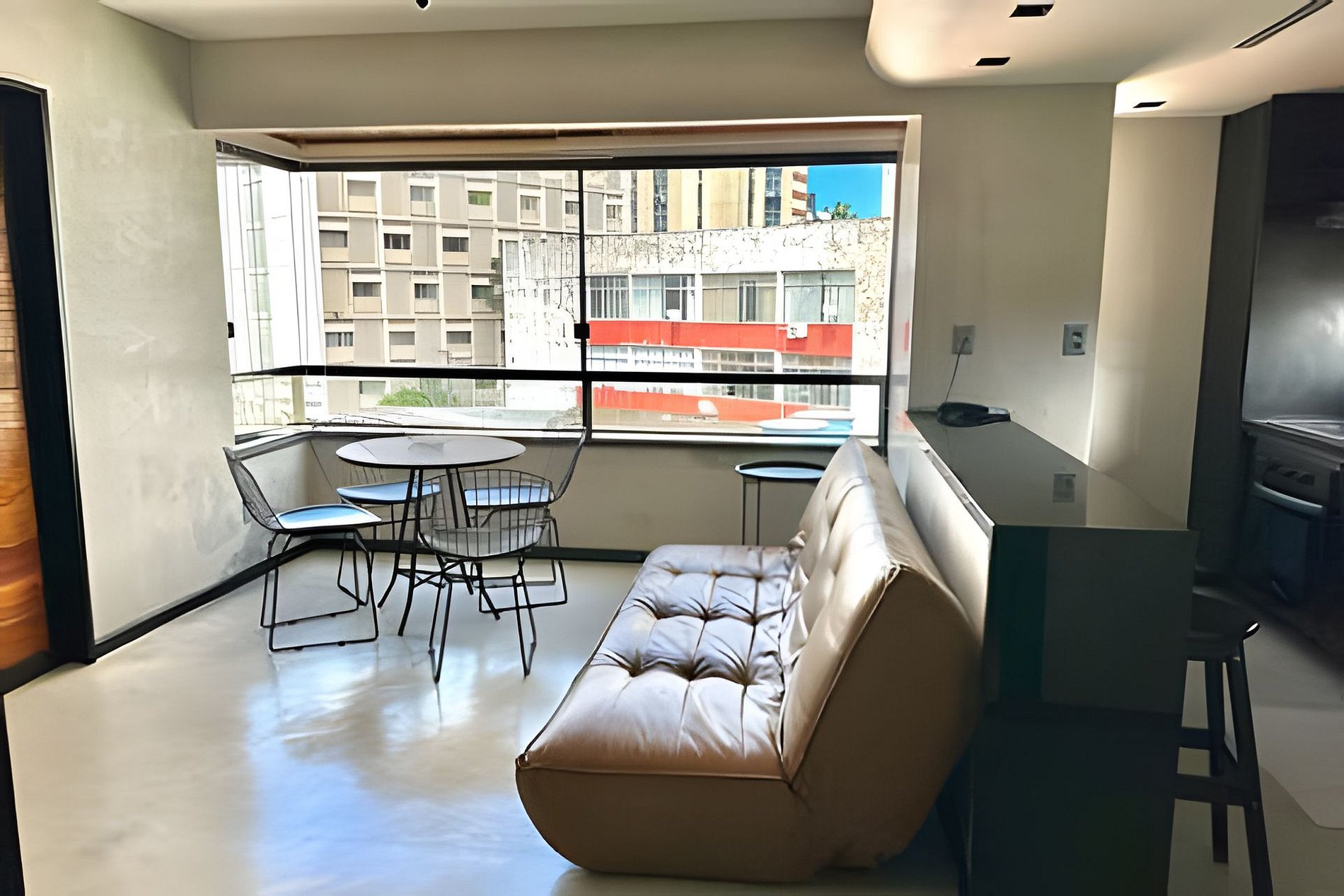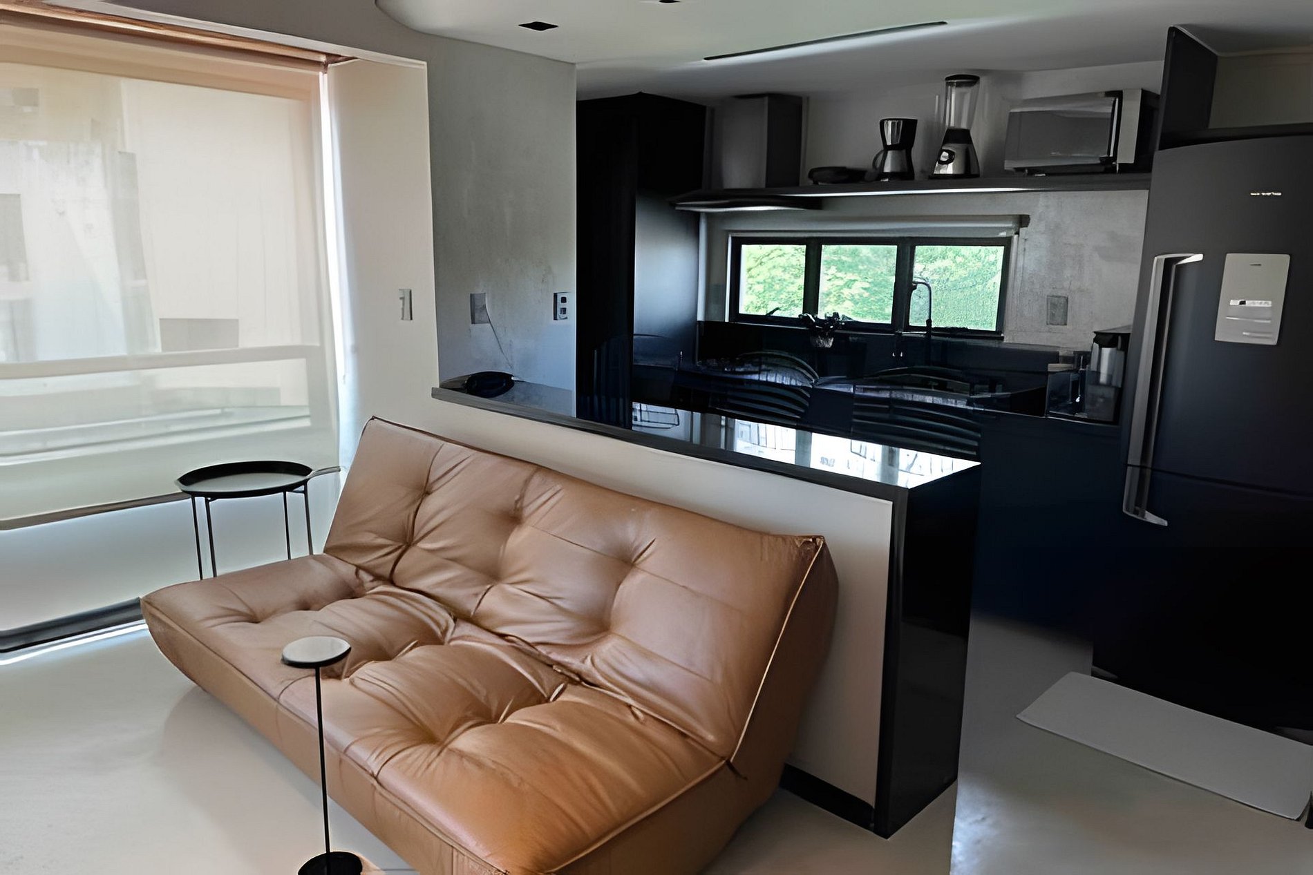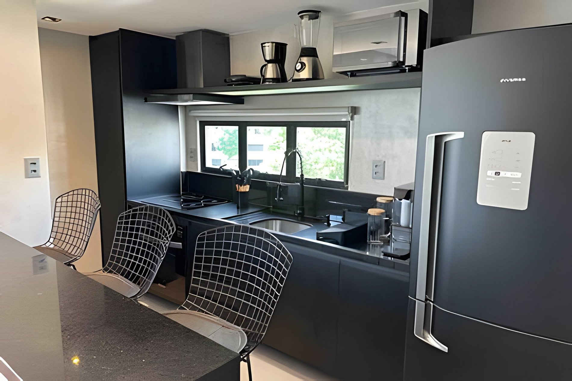 Apartamento recém reformado em alto estilo, com cozinha completa, quarto com ar condicionado, closet e banheiro.