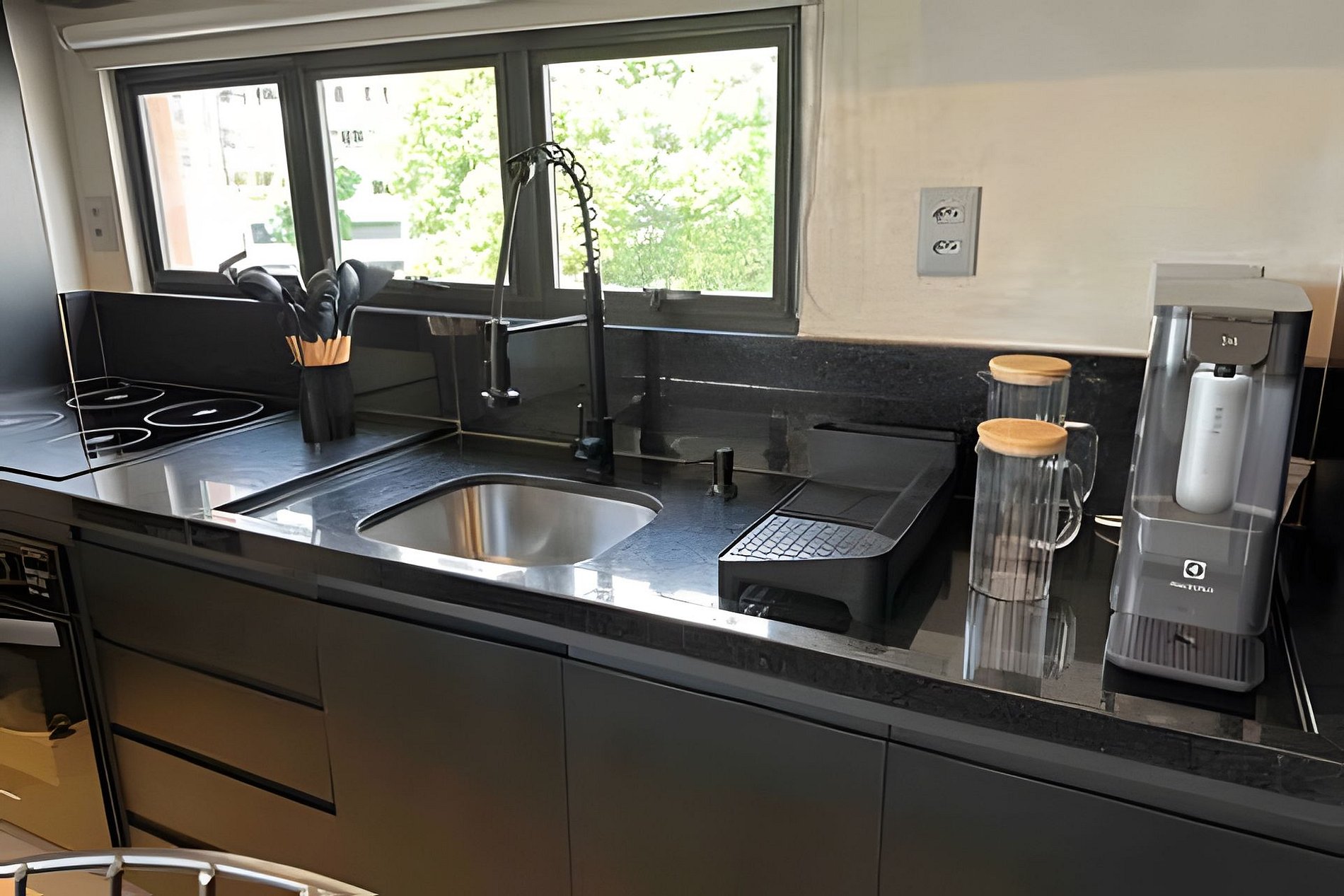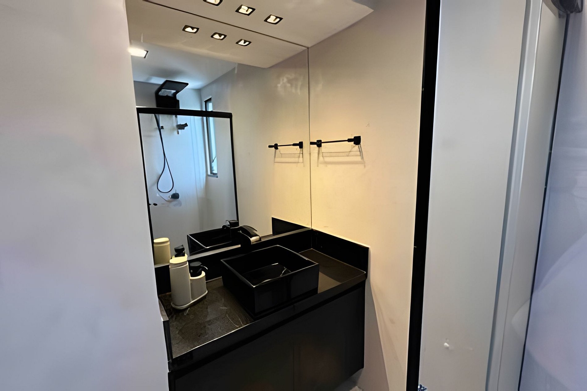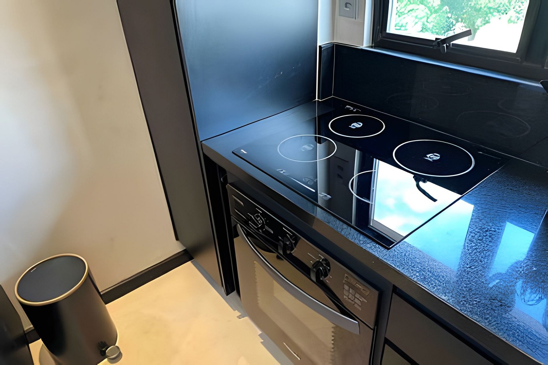 Apartamento recém reformado em alto estilo, com cozinha completa, quarto com ar condicionado, closet e banheiro.