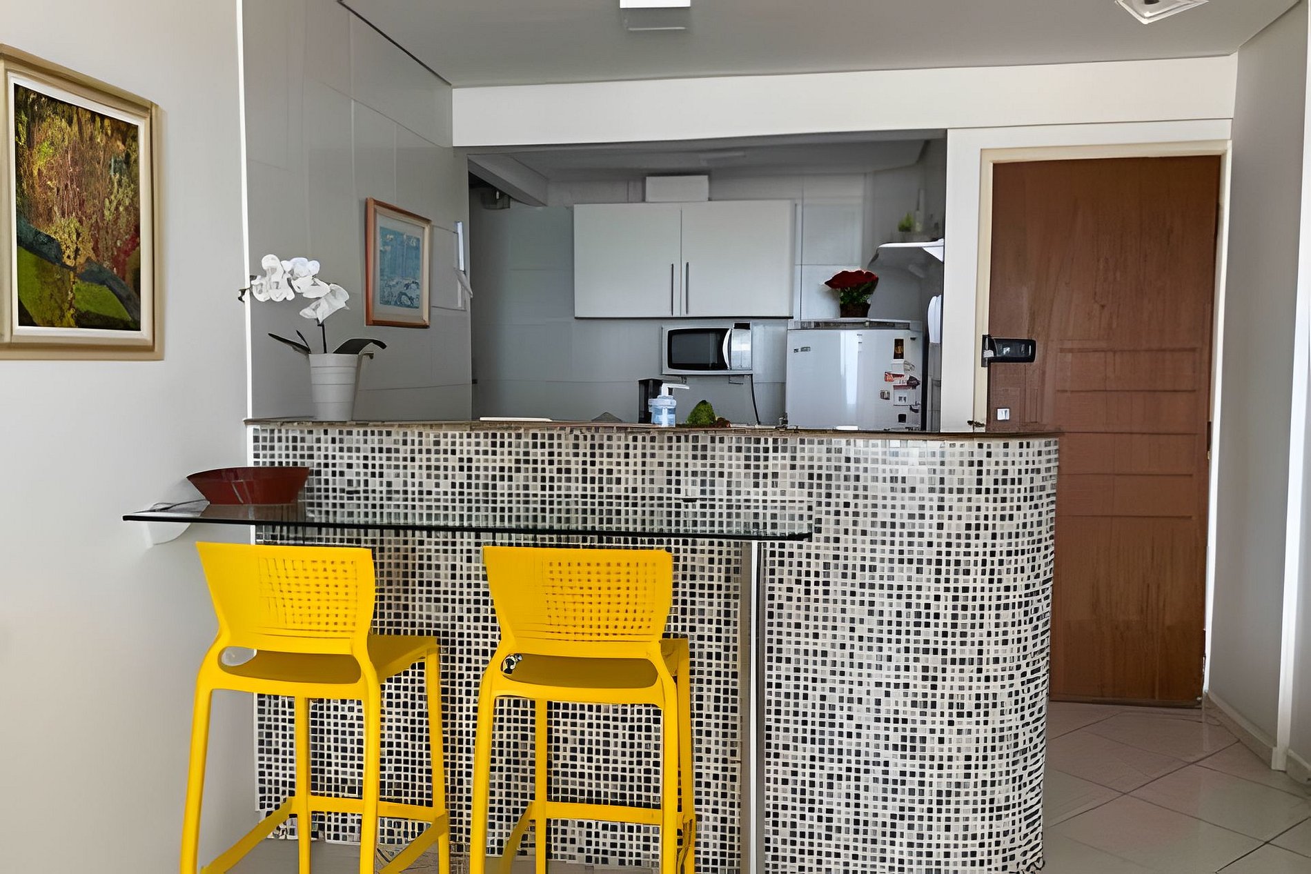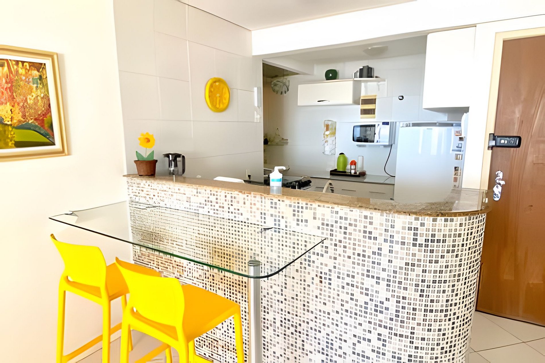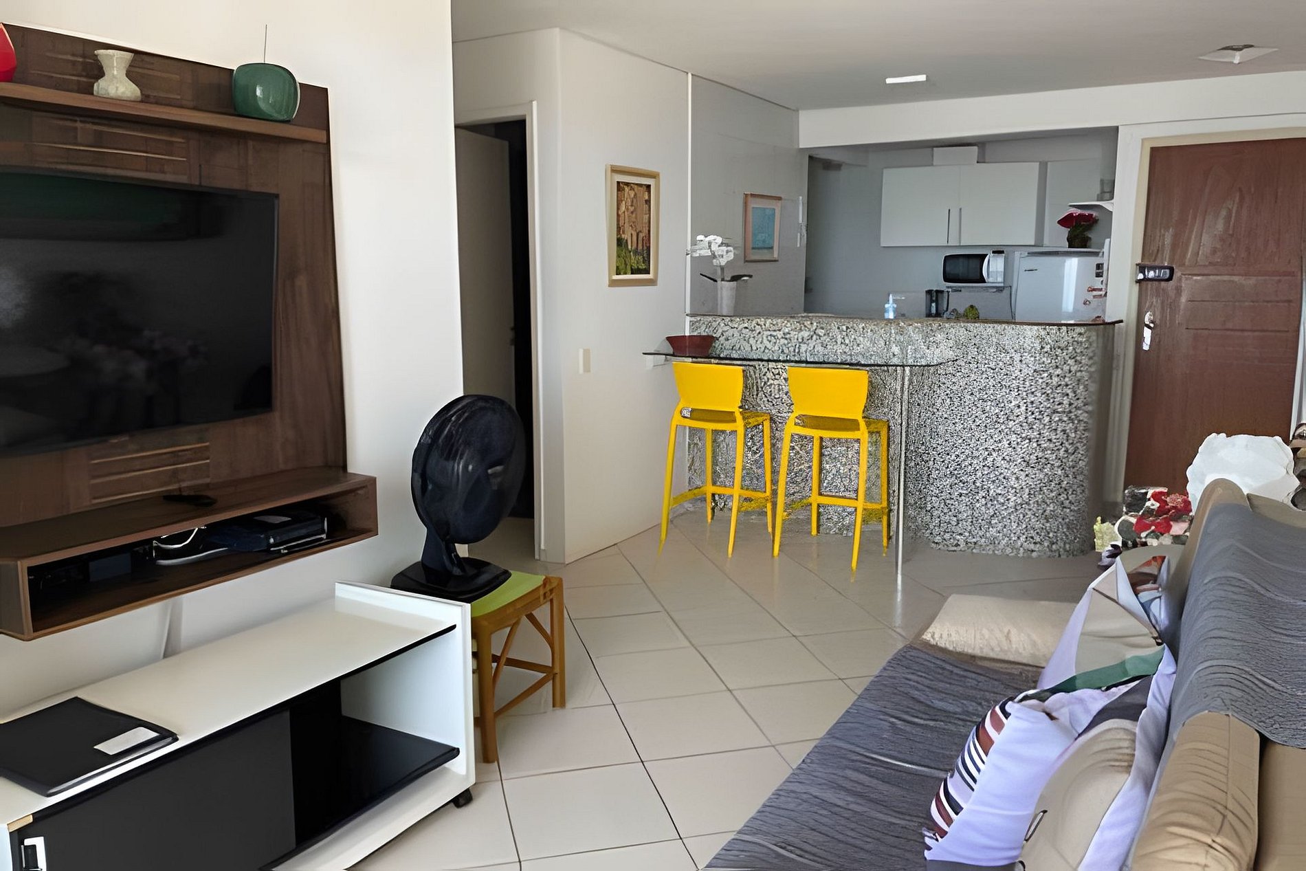 O apartamento é muito aconchegante, composto de sala ampla, com sofá-cama, Smart TV, mesa-bar.