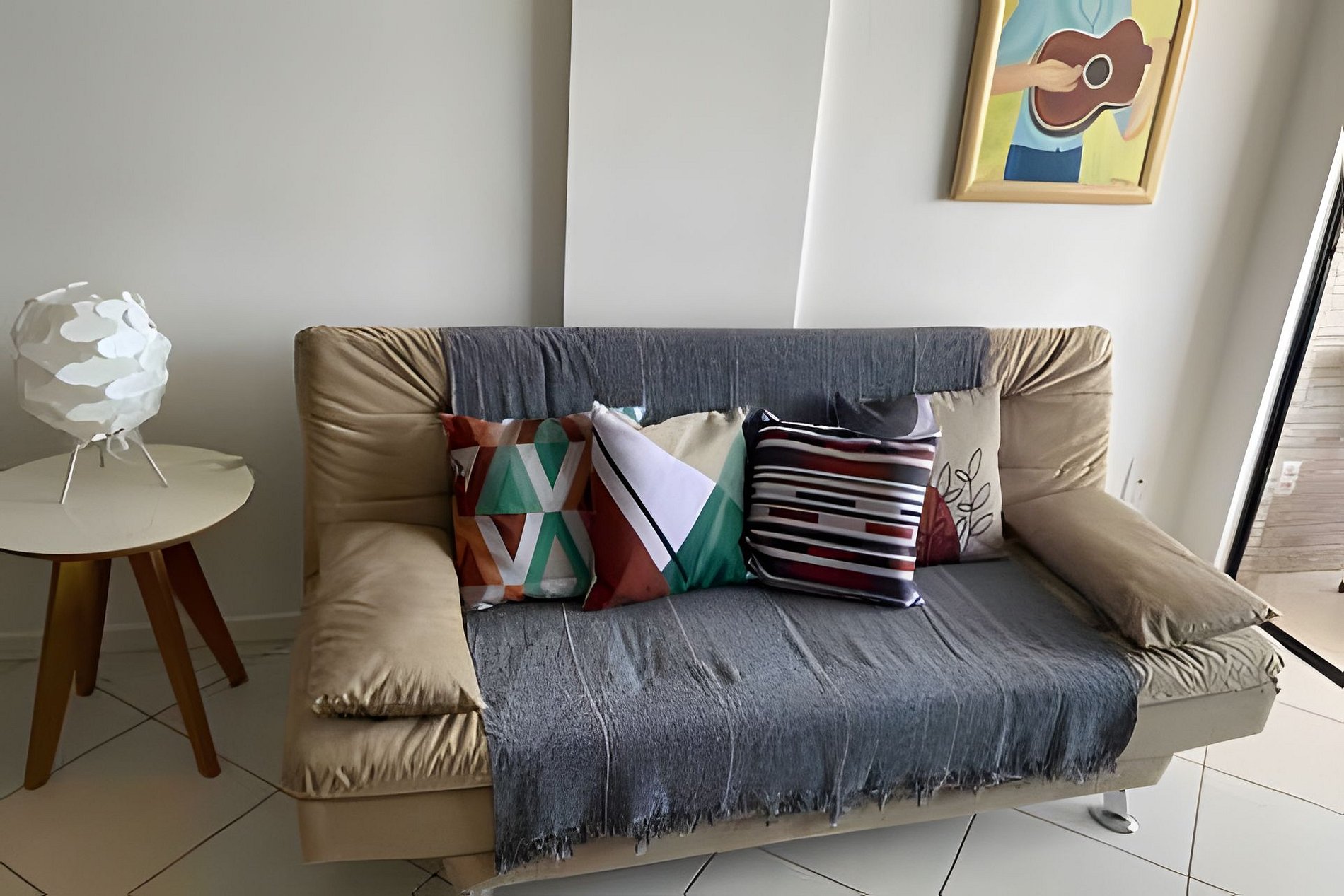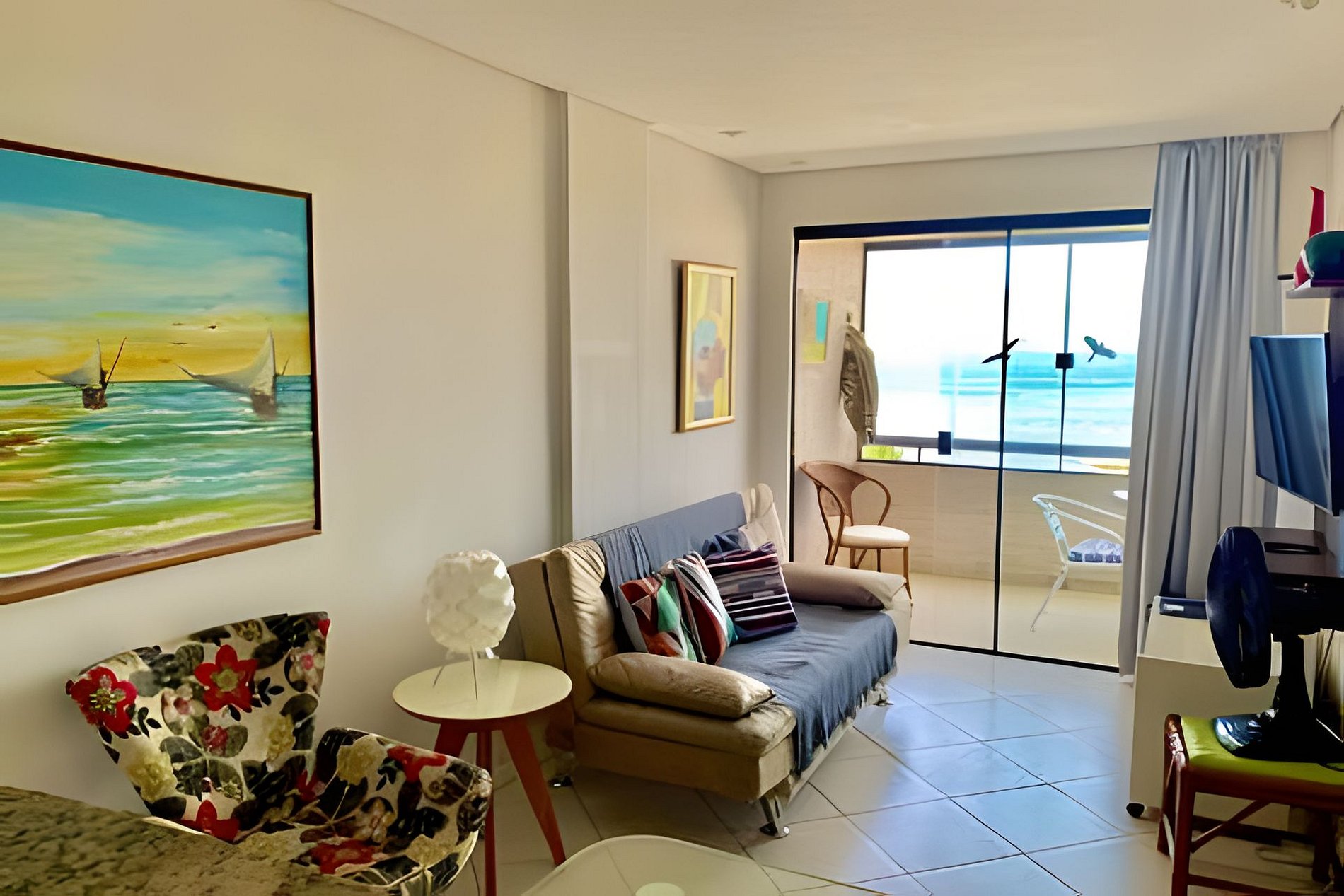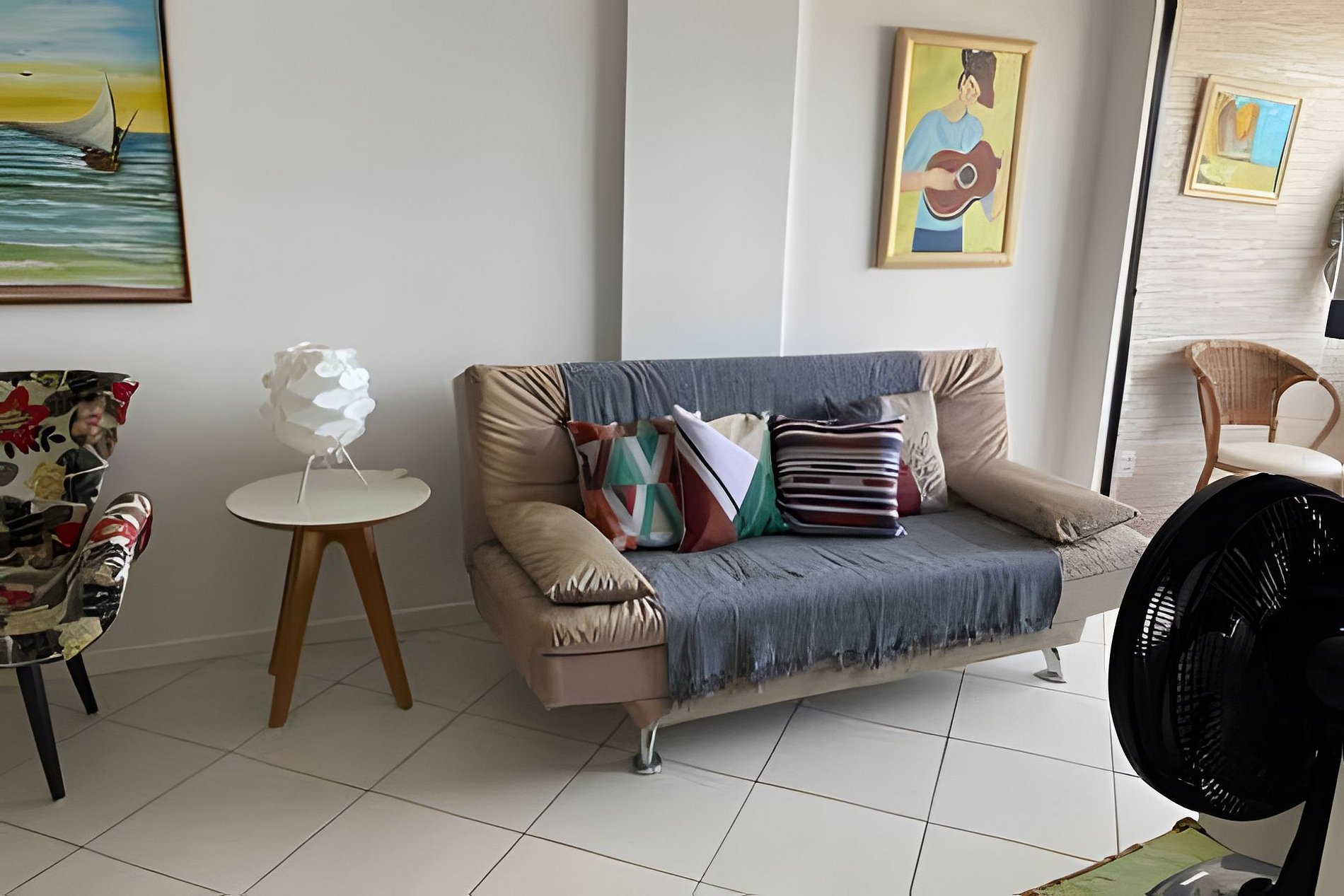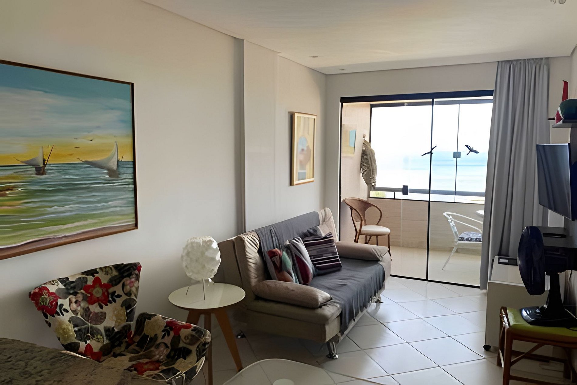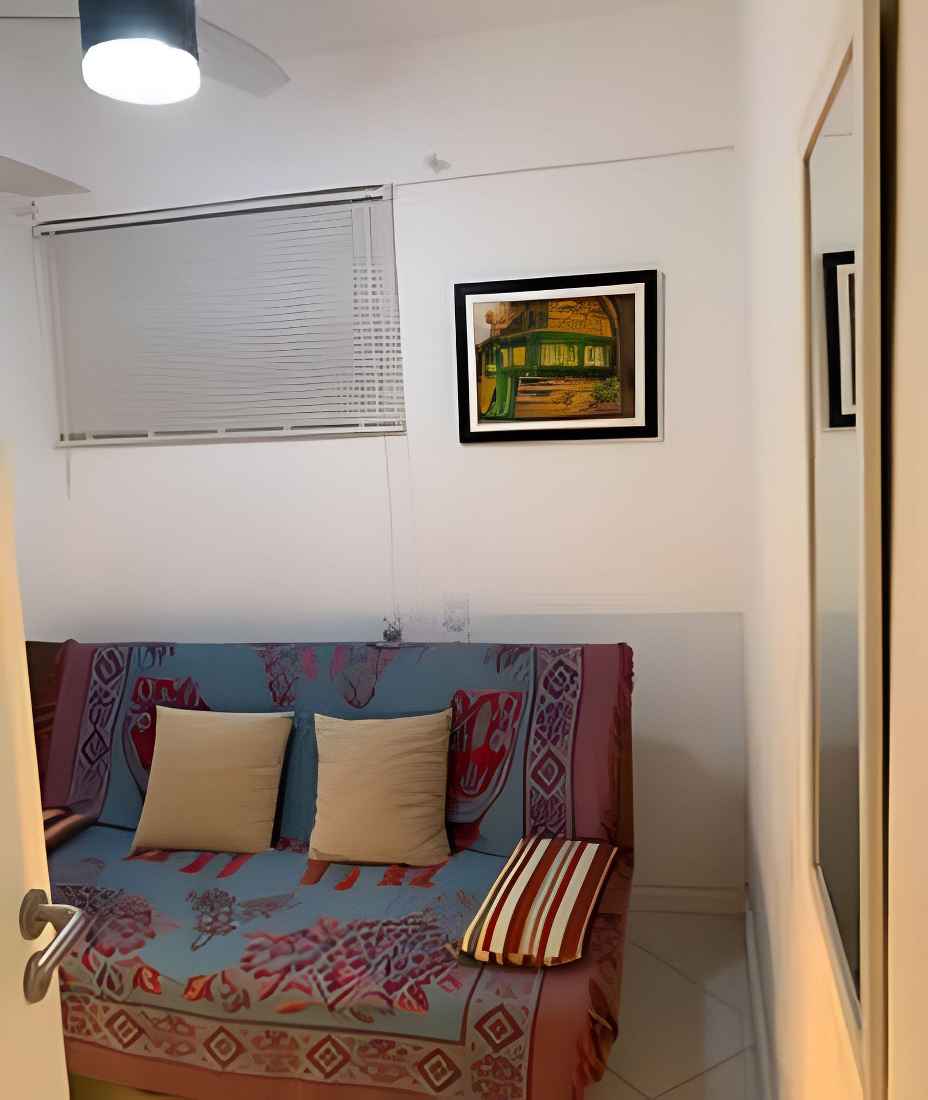 • Segundo quarto: sofá-cama casal, ventilador de teto, cortina persiana.