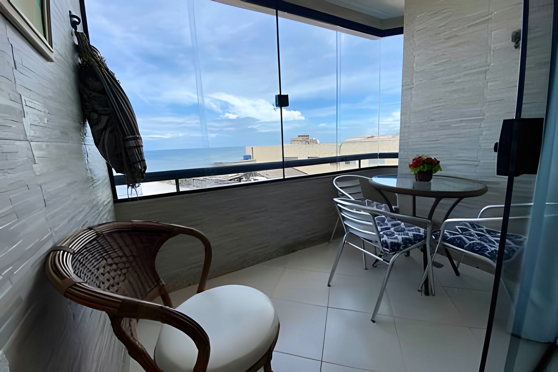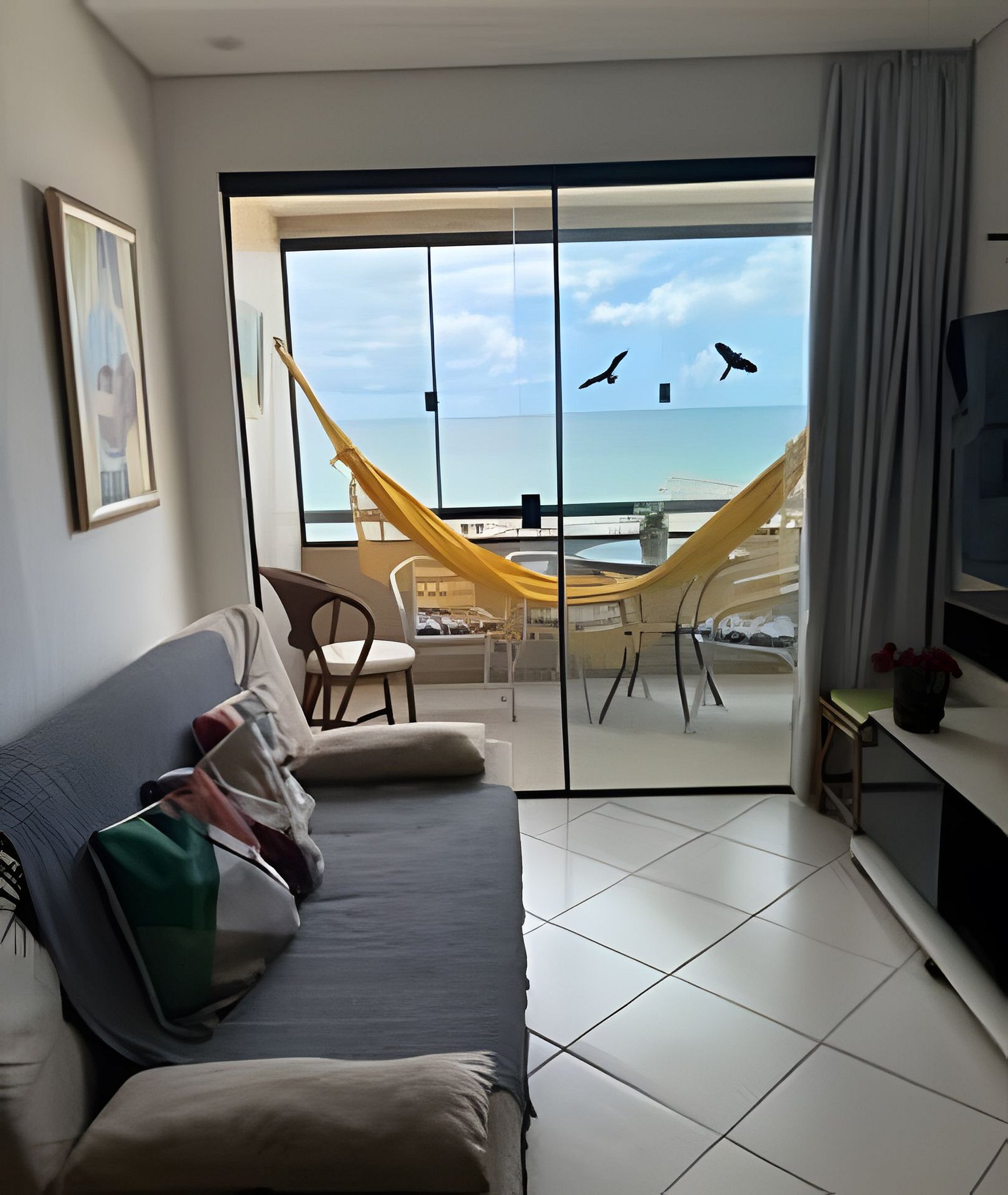 • Varanda com mesa/cadeiras, rede; bela vista para o mar.