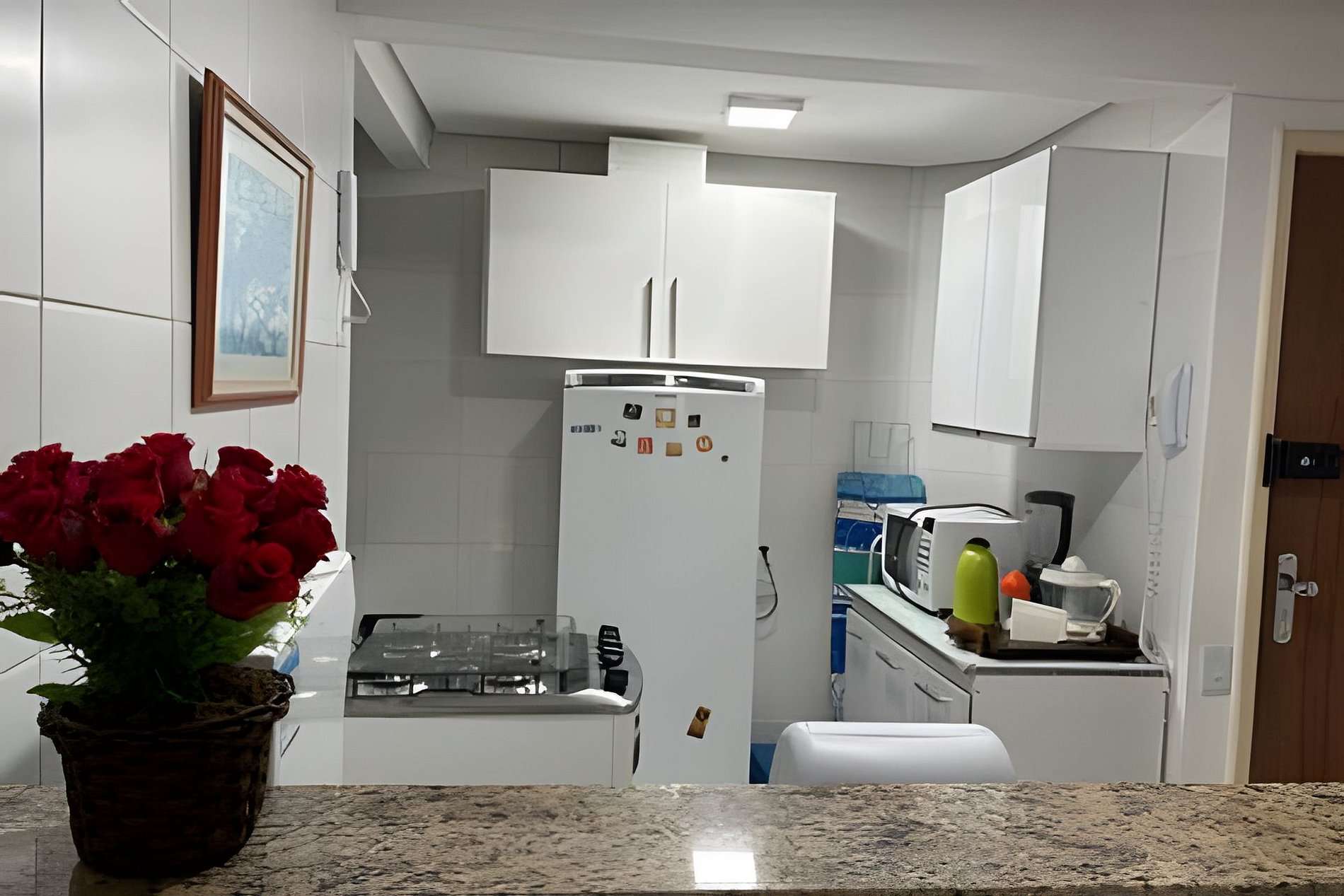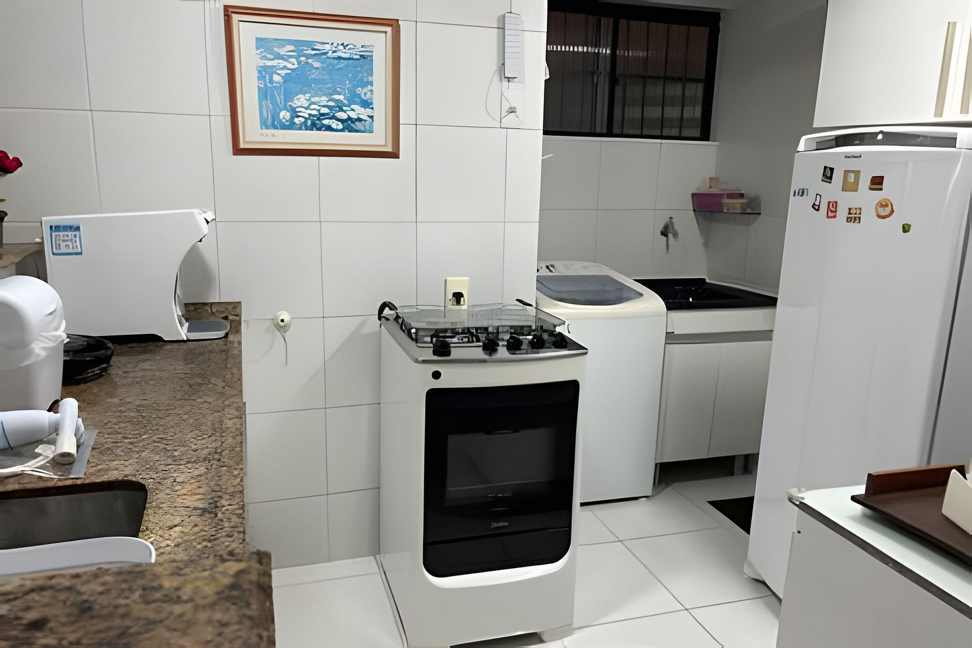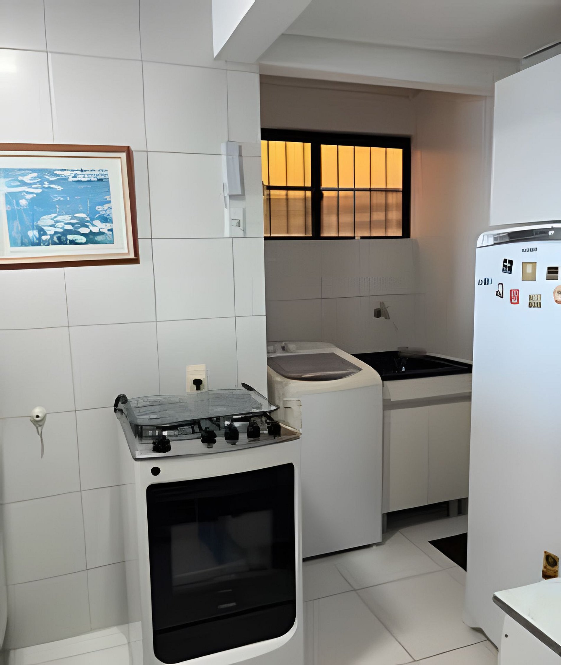 • Cozinha americana equipada com todos os utensílios; geladeira duplex frost free, microondas, fogão;