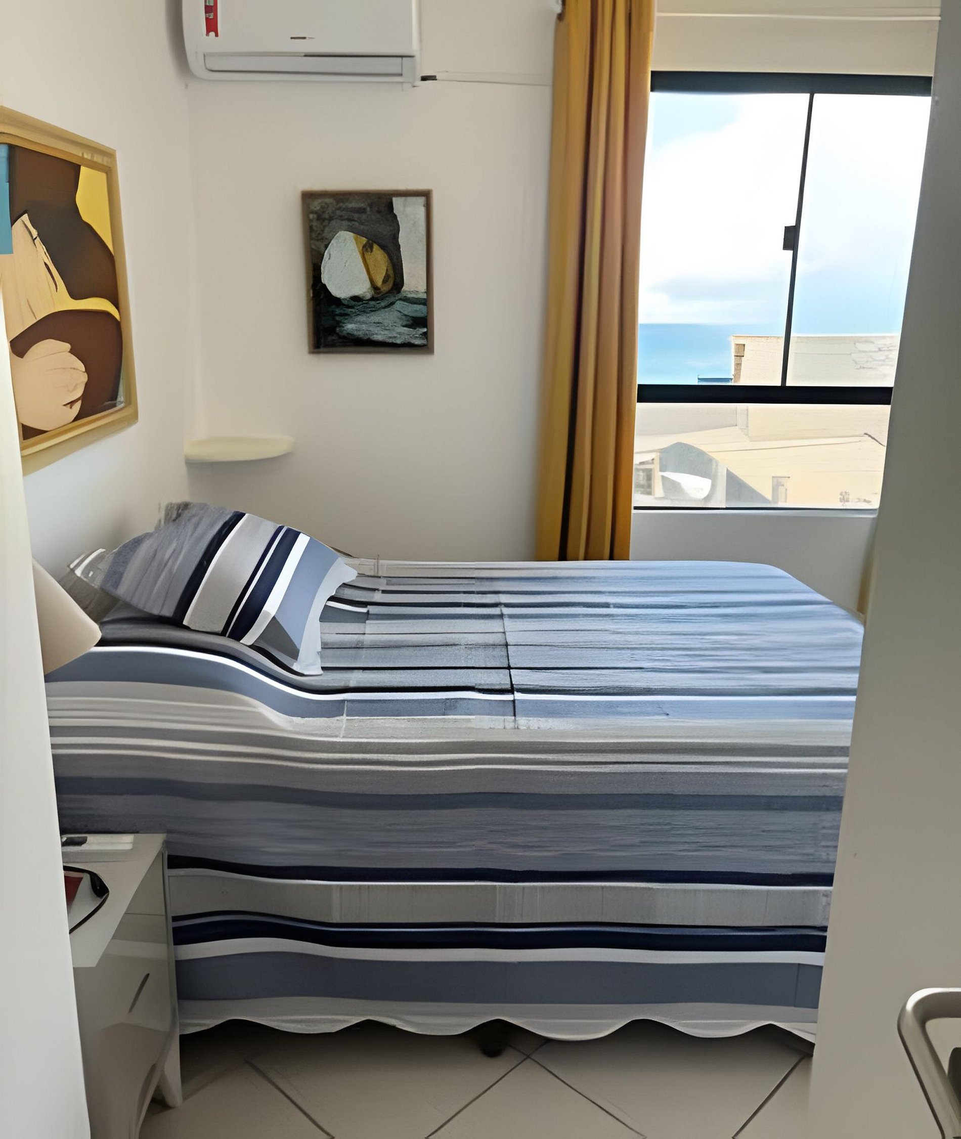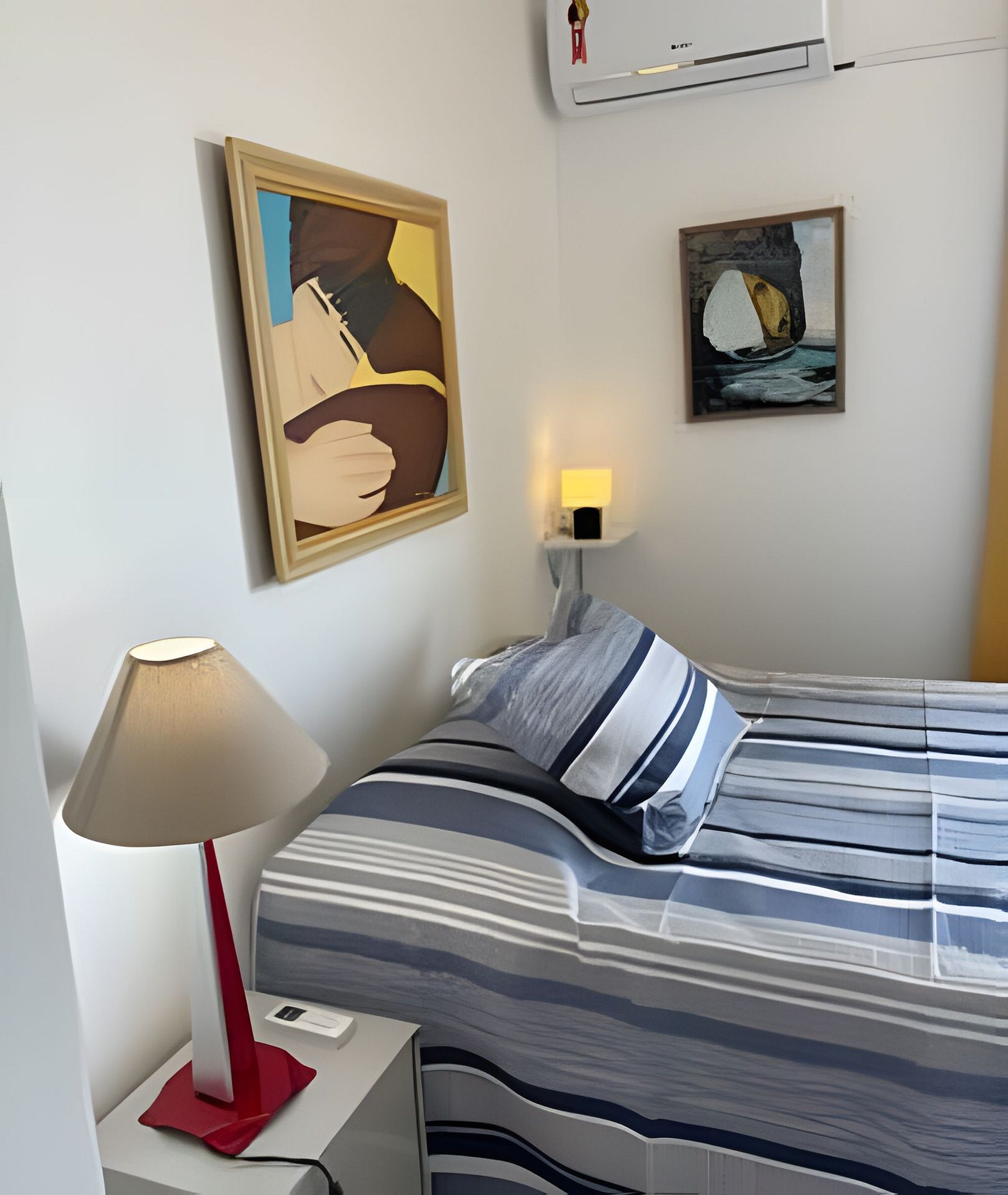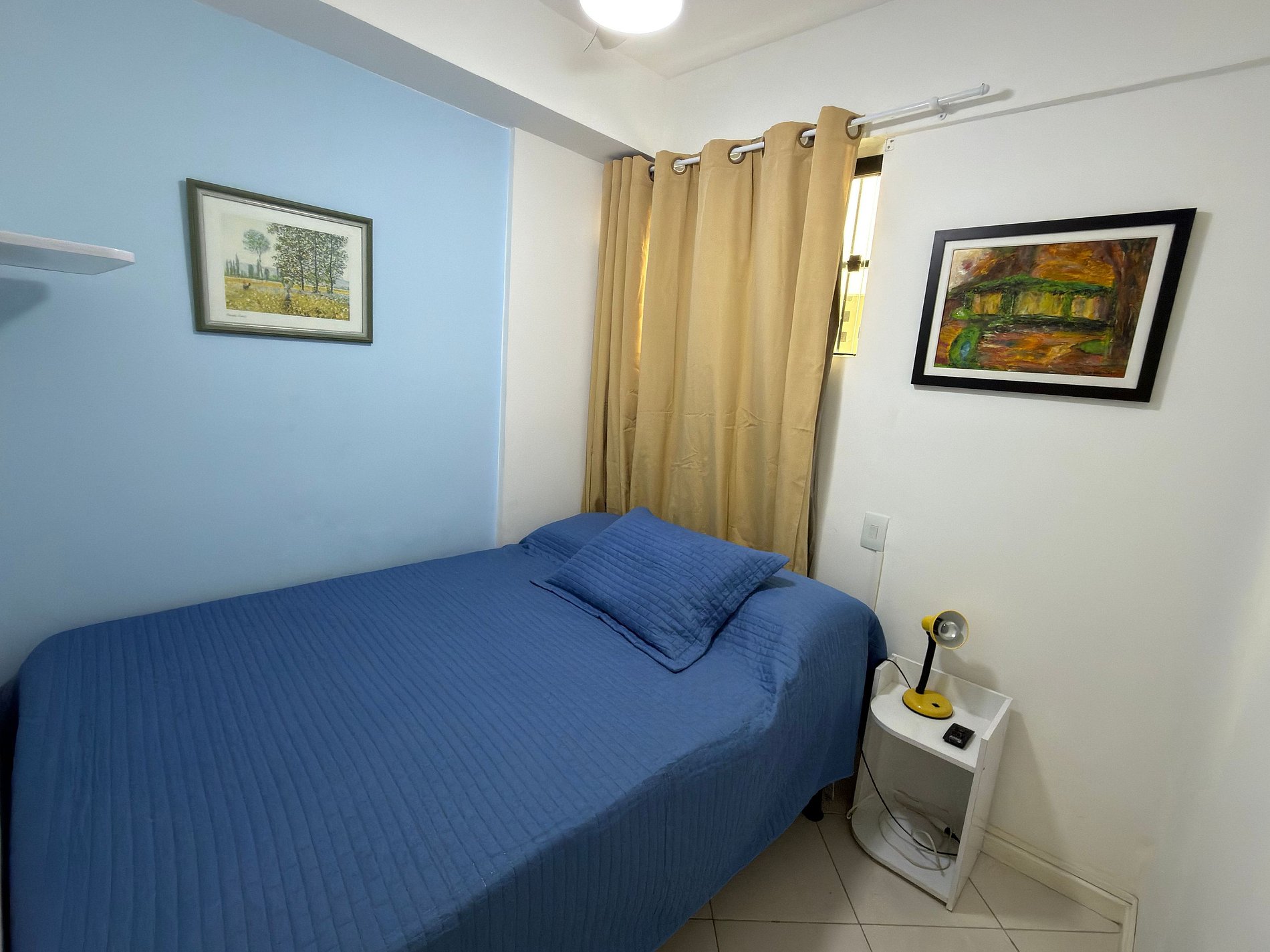 • Primeiro quarto: cama de casal/criado; armários, ar condicionado, ventilador de teto, cortina black-out, quadros.