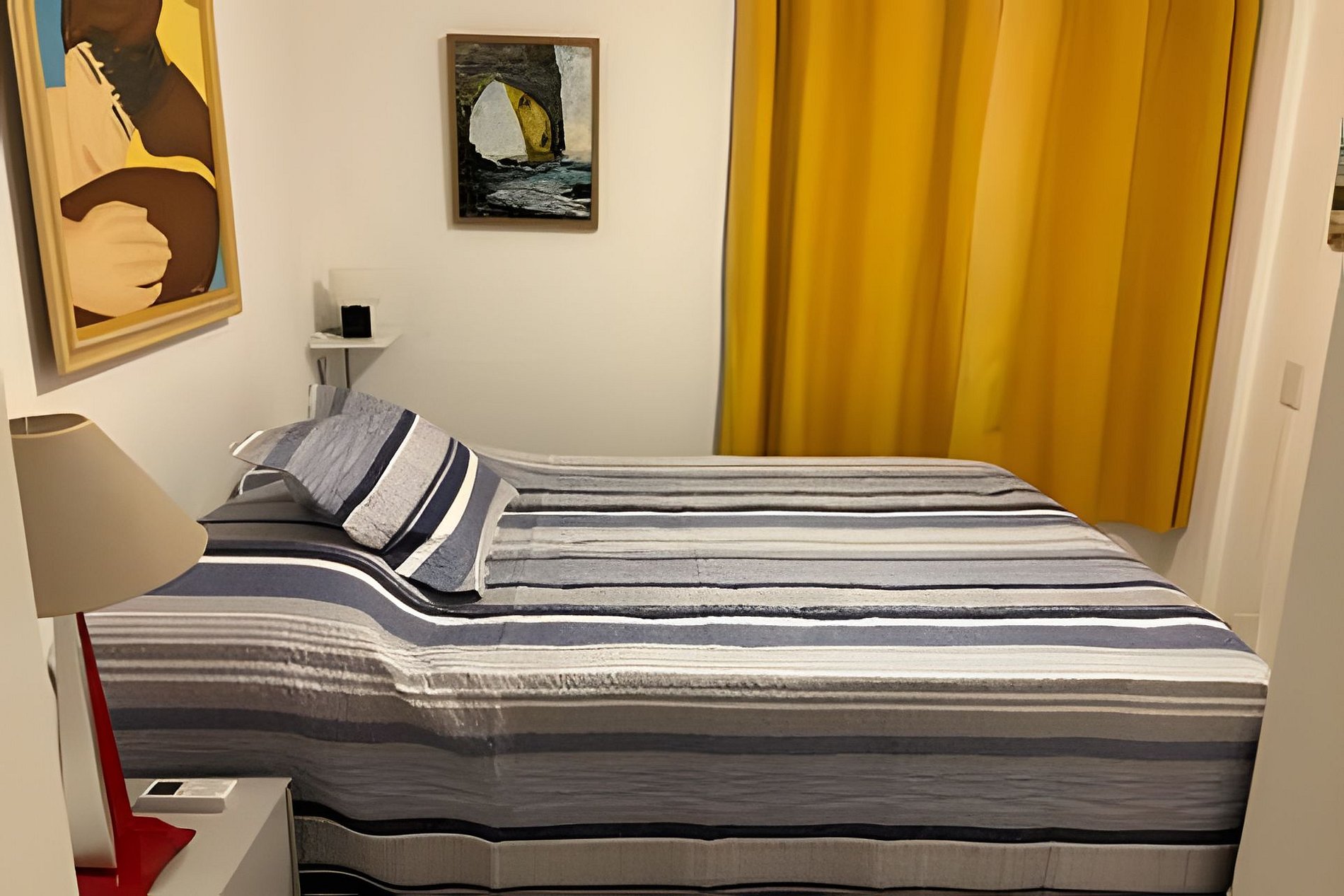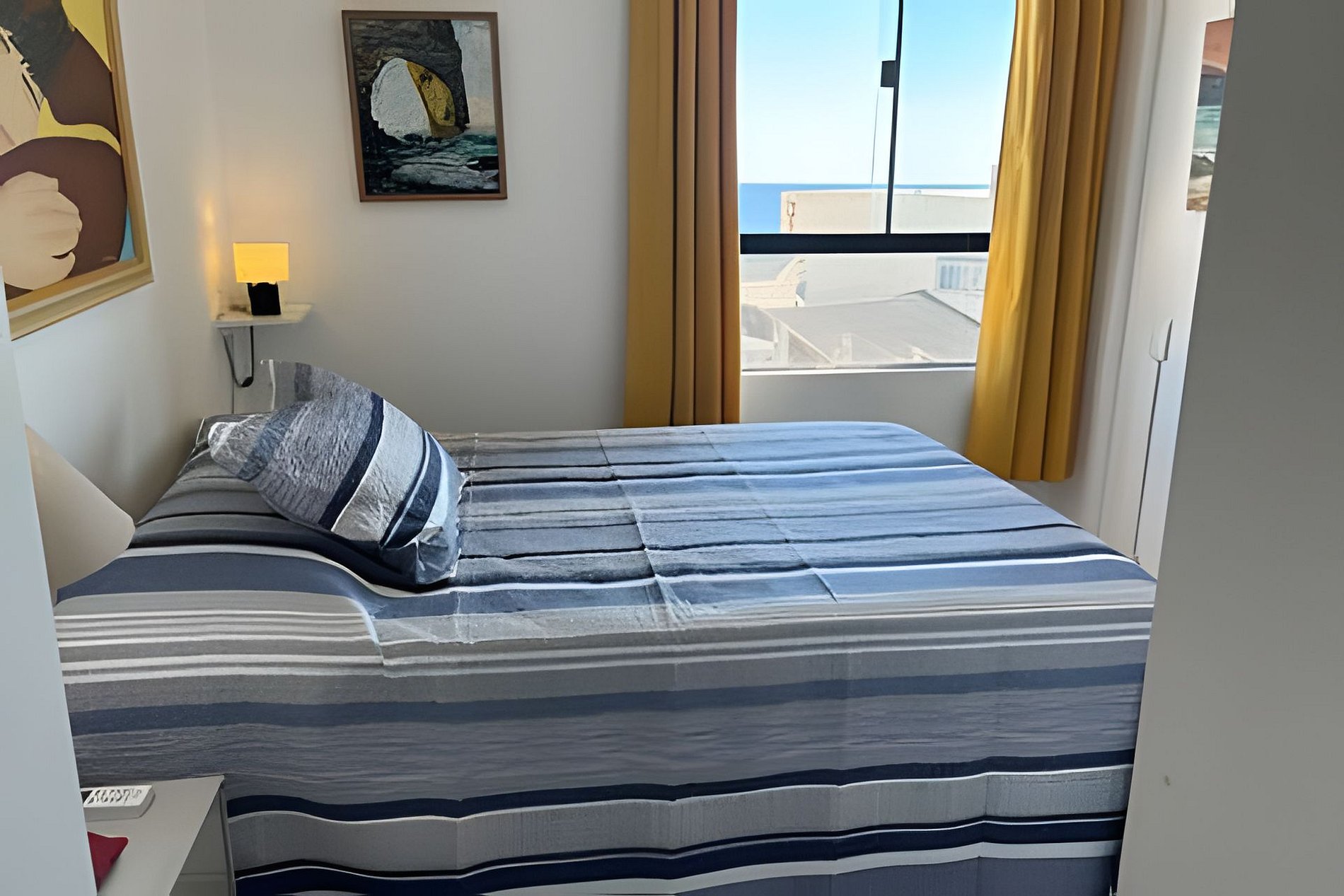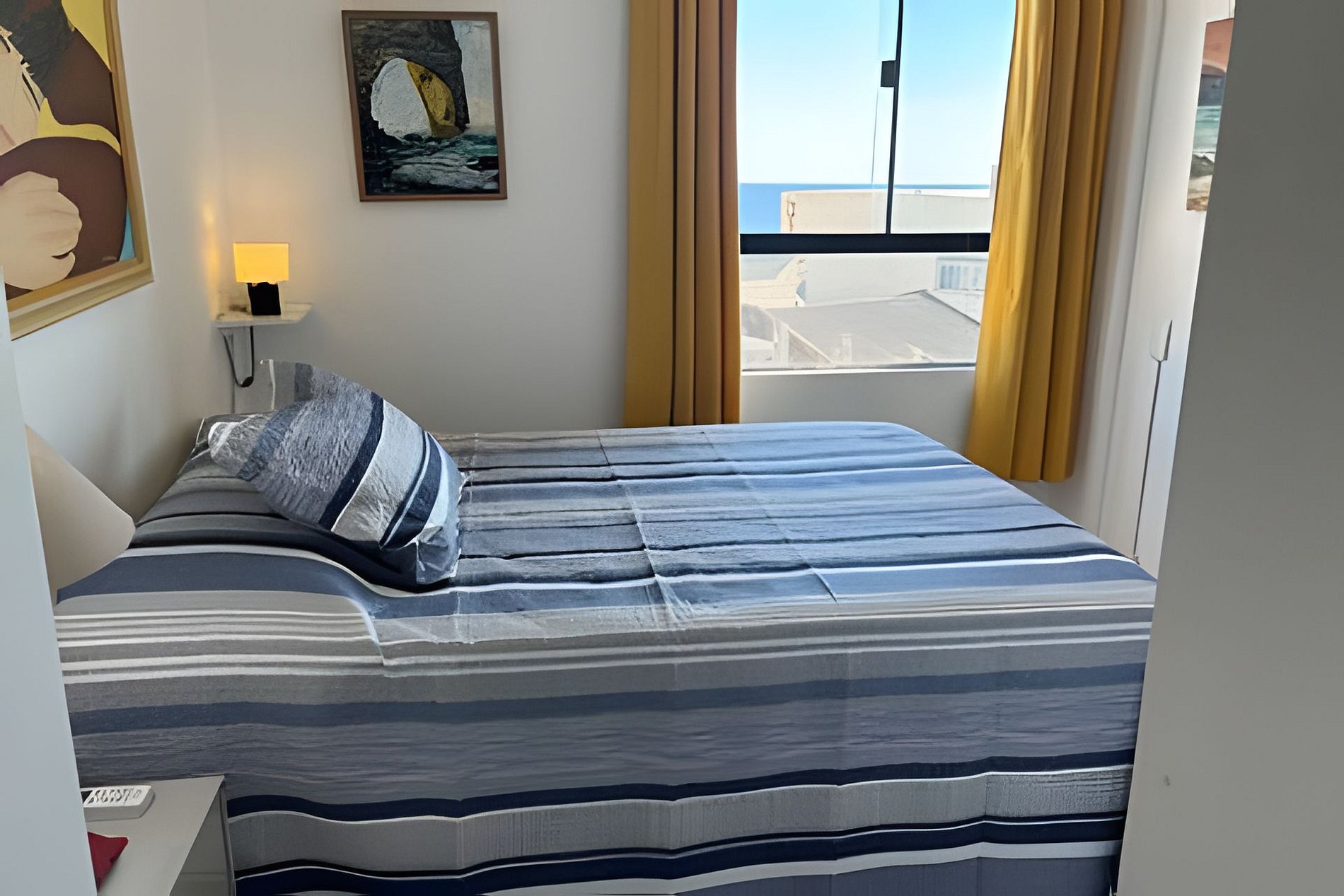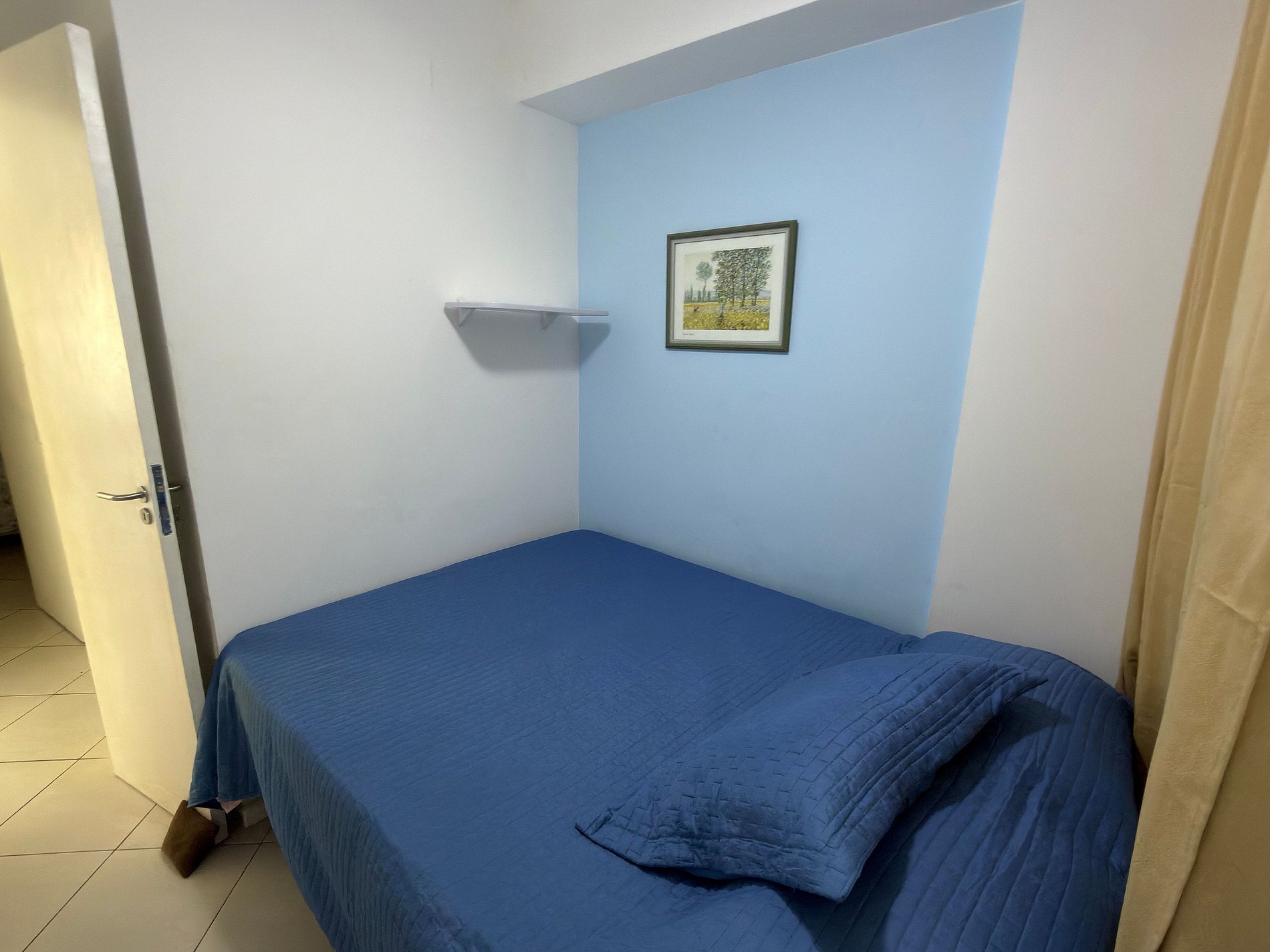 • Primeiro quarto: cama de casal/criado; armários, ar condicionado, ventilador de teto, cortina black-out, quadros.